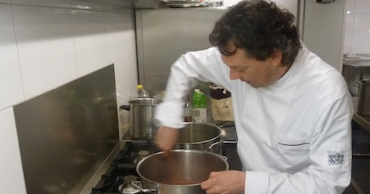 Vandaag staat er alleen een lunch op het programma. We bereiden een heerlijke krotenmosterdsoep met rucolaschuim (“die krotenmosterd heb ik ooit ontwikkeld speciaal voor Rotterdammers”), een risotto met truffel en Parmezaanse kaas en een chocolademousse voor. In de keuken vertelt hij met grote liefde over zijn creatieve creaties, maar komen ook de mooiste anekdotes uit de kast. Zo schrok hij zich ooit helemaal lam toen hij in de keuken een zwaar bebloede kok zag kermen van de pijn. “Ik belde meteen 112 en dacht dat hij het loodje ging leggen. Op dat moment schoten de koks schaterend in de lach: het bloed was nep en ze hadden Yuri een mooie poets gebakken.”